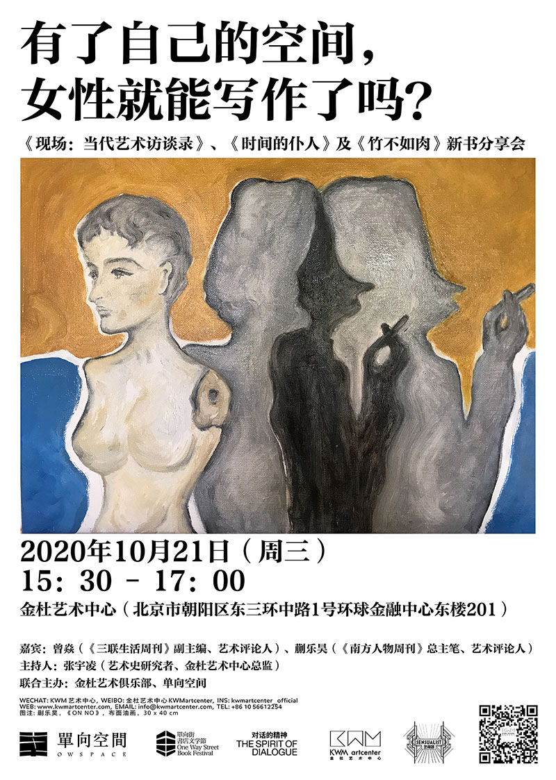 关于女性写作,你知道多少?除了伍尔芙的那句,女人要想从事写作,首先要有一间自己的屋子,但这并不意味着,有了一个独立的、不受打扰的空间,女性就可以自动下笔如有神了。10月21日周三下午三点半,金杜艺术中心联合单向空间邀请《南方人物周刊》总主笔蒯乐昊、《三联生活周刊》副主编曾焱和金杜艺术中心总监张宇凌一起进行一场关于女性、友谊及文艺的谈话,三位女性写作者是闺中蜜友,也是艺术和文学领域的同道,她们带来了三本她们新近写作的新书:中短篇小说集《时间的仆人》、当代艺术访谈录《现场》和侧重于古代艺术史的《竹不如肉》。